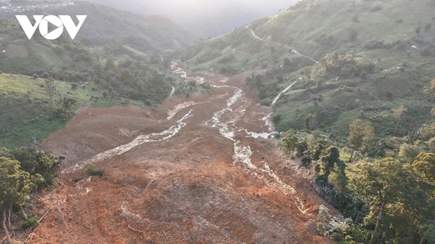 Hiện trường vụ sạt lở. Ảnh VOVHơn nửa tháng sau vụ sạt lở núi AZắt, người dân thôn Pứt (xã Hùng Sơn, thành phố Đà Nẵng – huyện Tây Giang, Quảng Nam cũ) vẫn chưa hết bàng hoàng. Chỉ trong vài tiếng nổ lớn, đất đá từ núi đổ ập xuống cuốn trôi mọi thứ, khiến 3 người dân bị vùi lấp, đến nay mới tìm thấy 1 thi thể. Quá trình tìm kiếm tiếp tục gặp nguy hiểm do xuất hiện thêm nhiều vết nứt và sạt trượt.