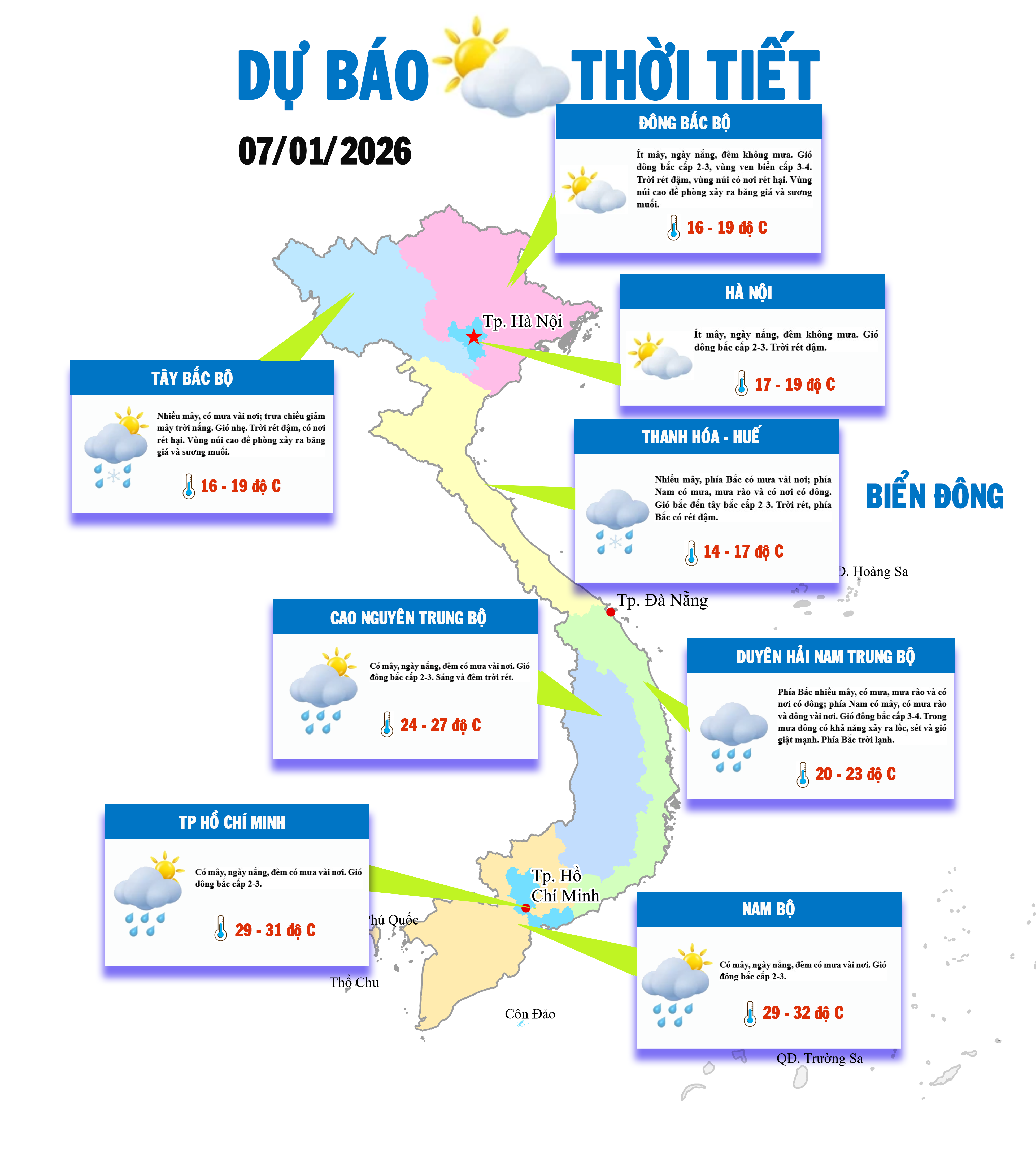 Theo Trung tâm Dự báo KTTV quốc gia, ngày 07/01, không khí lạnh tiếp tục tăng cường, gây mưa và làm nhiệt độ giảm sâu tại nhiều khu vực từ Bắc Bộ đến Nam Trung Bộ. Bắc Bộ và Thanh Hóa rét đậm, vùng núi có nơi rét hại.