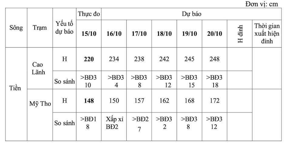 Theo Đài Khí tượng thuỷ văn tỉnh Đồng Tháp, mực nước tại hầu hết các trạm trên sông Tiền đang lên nhanh. Đến 07 giờ ngày 16/10, mực nước cao nhất ngày thực đo tại trạm Cao Lãnh và Mỹ Tho ở mức từ báo động II đến báo động III.