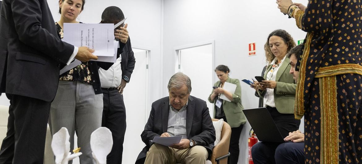 Tổng thư ký Liên hợp quốc António Guterres (ở giữa) xem xét các tài liệu cùng các đồng nghiệp tại Hội nghị về khí hậu của Liên hợp quốc ở Brazil.Về nhiên liệu hóa thạch, Tổng Thư ký Liên Hợp Quốc kêu gọi một quá trình chuyển đổi "công bằng, trật tự và bình đẳng", như đã được nhất trí tại COP28. "Sẽ không có giải pháp nào nếu không có sự chuyển đổi công bằng từ nhiên liệu hóa thạch sang năng lượng tái tạo", ông nói, đồng thời kêu gọi chấm dứt "những bóp méo thị trường có lợi cho nhiên liệu hóa thạch" và thông tin sai lệch "nhằm phá hoại quá trình chuyển đổi".