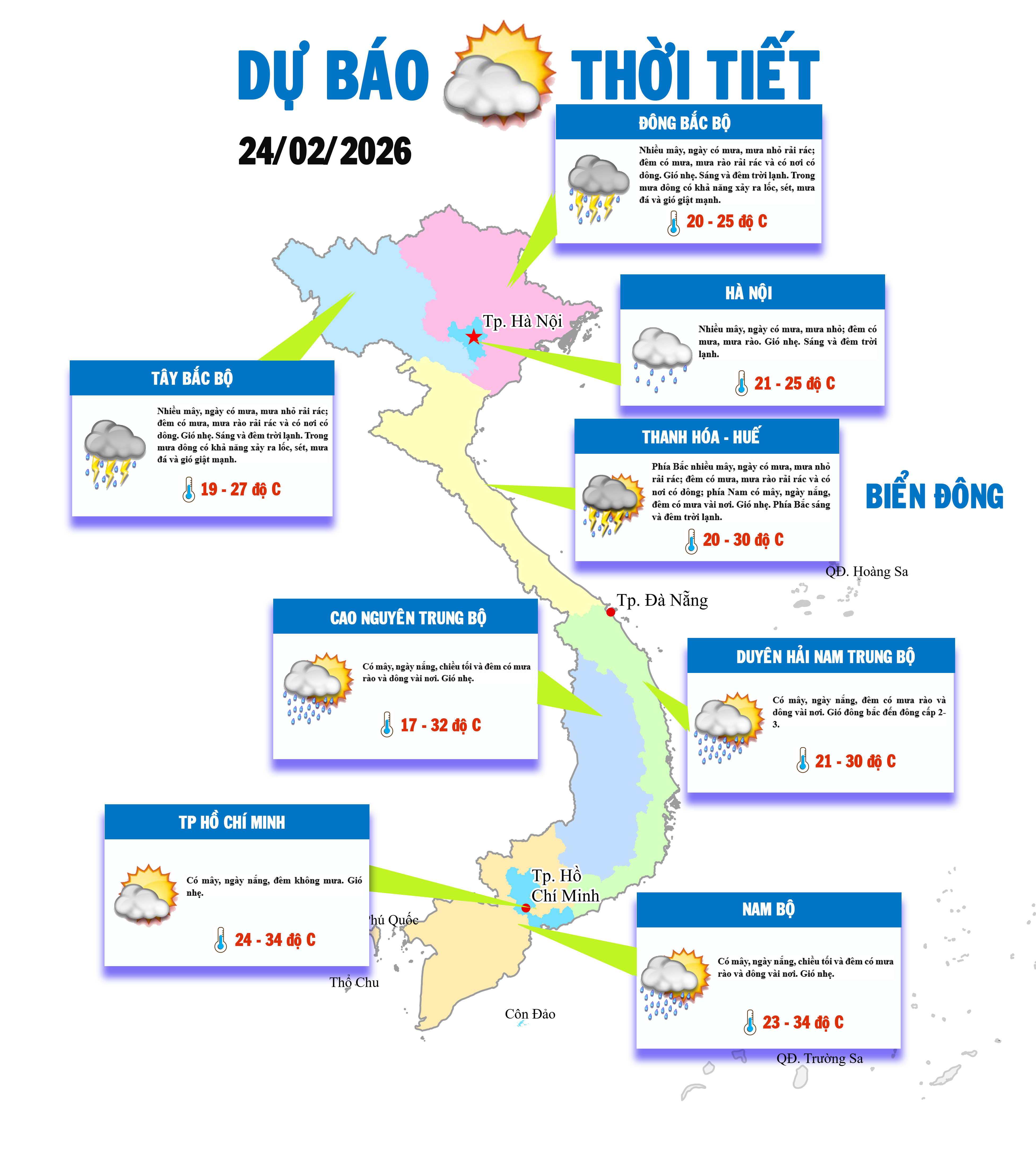 Theo Trung tâm Dự báo KTTV Quốc gia, ngày 24/02, khu vực Bắc Bộ, bao gồm thủ đô Hà Nội trời nhiều mây, có mưa nhỏ, mưa phùn và sương mù rải rác, trời rét về đêm và sáng. Các tỉnh Nam Trung Bộ, Tây Nguyên và Nam Bộ ngày nắng. Khu vực Đông Nam Bộ nắng nóng, nhiệt độ cao nhất có nơi trên 34 độ C.
